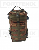 Mochila fabricada em RipStop Cedro, conta com sistema MOLLE, para acoplagem de módulos, 5 compartimentos, alças acolchoadas e removíveis, correias de compressão e cintos de fixação.