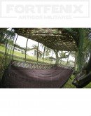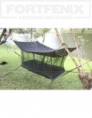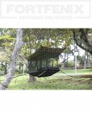 Mosquiteiro fixado no teto e na rede, com abertura e fechamento com zíper na posição horizontal